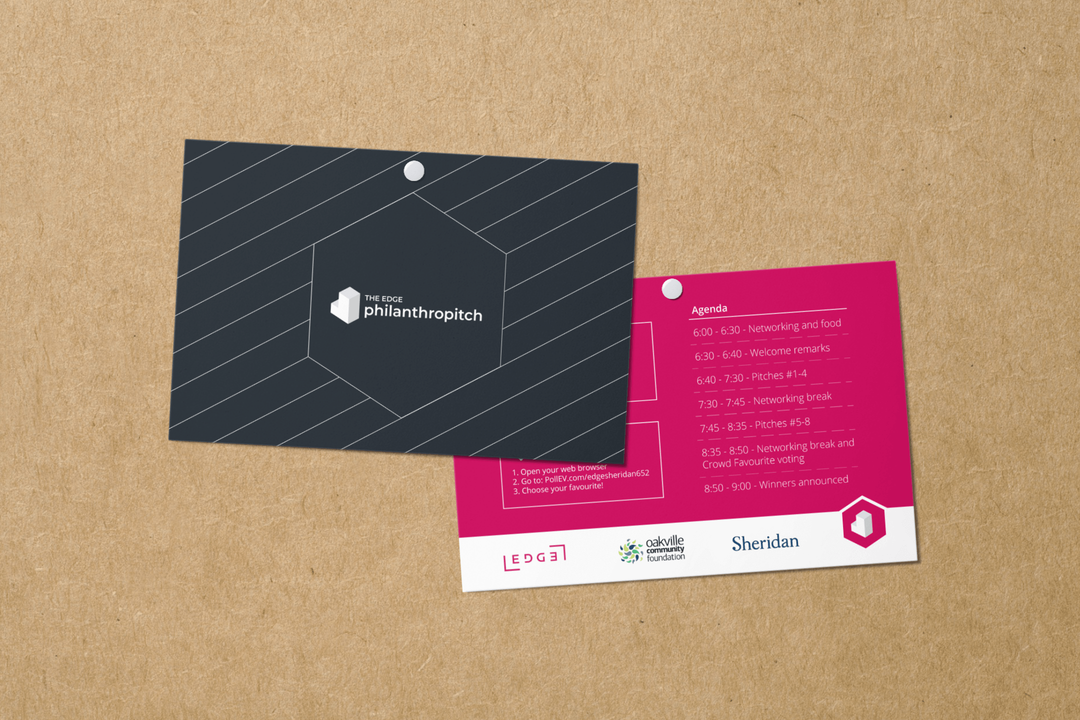 While working for EDGE, Sheridan's Entrepreneurship Discovery & Growth Engine, my team and I were tasked with creating a visual identity and website to promote The EDGE Philanthropitch; a pitch event centred around social impact and community building.